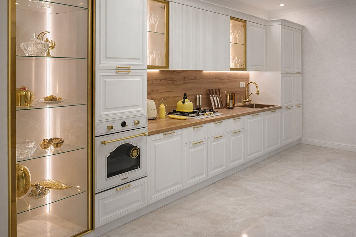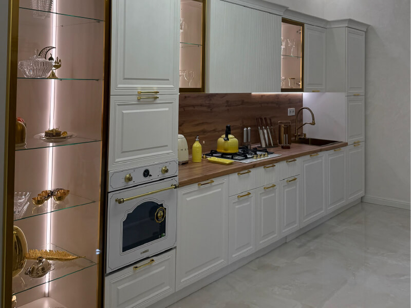 Кухонный гарнитур «Лондон» — это сочетание классического дизайна и современной функциональности. Элегантные белые фасады, стеклянные витрины и качественная фурнитура создают стильный и практичный интерьер. Подходит для просторных кухонь и адаптируется под индивидуальные размеры.