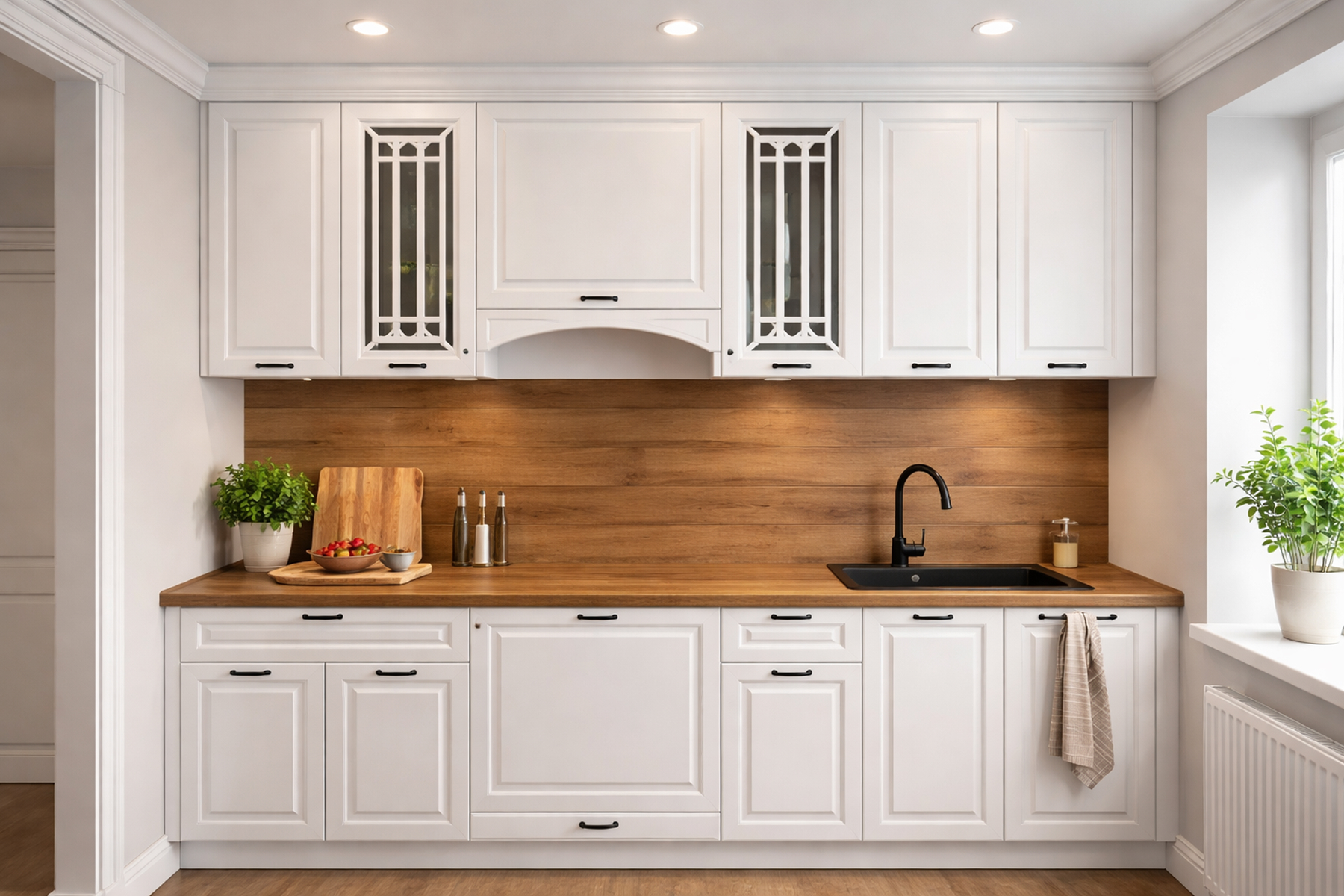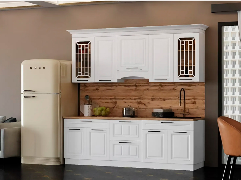 Кухонный гарнитур «Лондон» — это сочетание классического дизайна и современной функциональности. Элегантные белые фасады, стеклянные витрины и качественная фурнитура создают стильный и практичный интерьер. Подходит для просторных кухонь и адаптируется под индивидуальные размеры.
