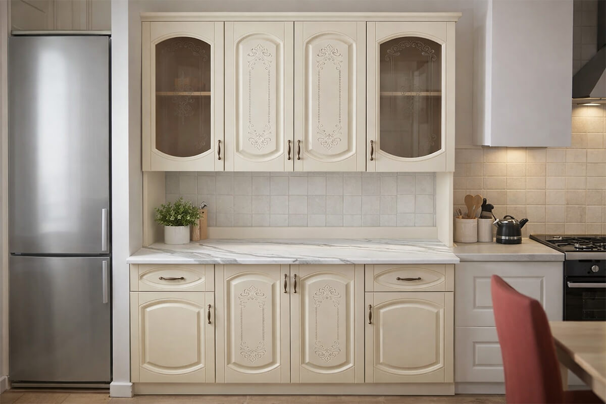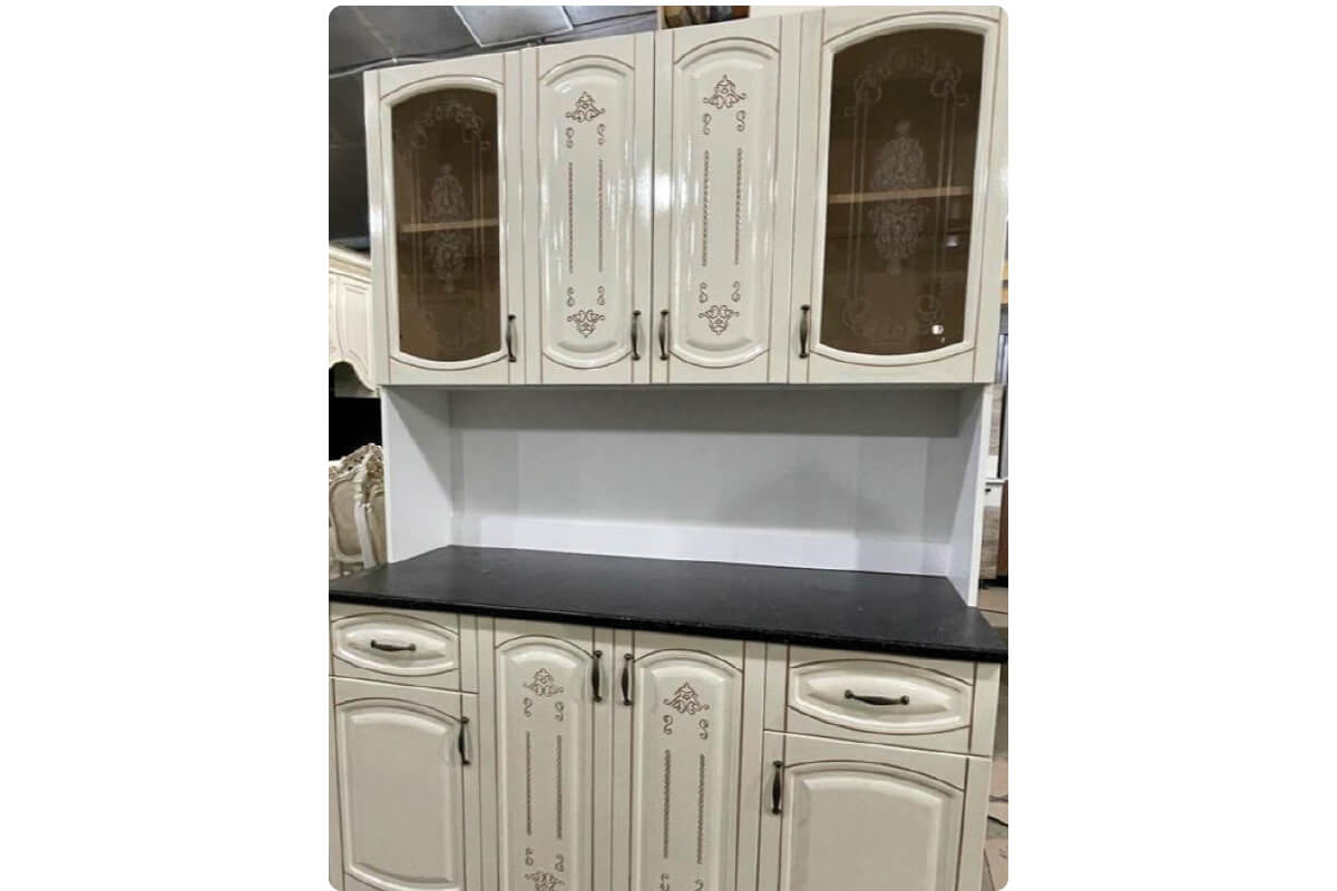 Посудный шкаф «Бьянка» от мебельной фабрики "Ключ" — изящная белая модель с витражными фасадами, идеально подходящая для классического интерьера. Функциональный, вместительный и выполнен с вниманием к деталям — отличный выбор для современной кухни.