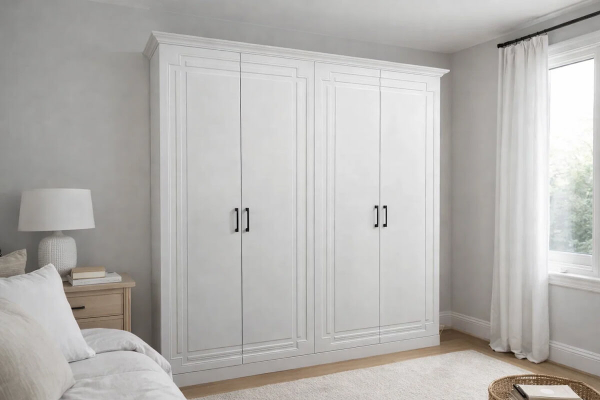 Элегантный 4-дверный шкаф с рельефными фасадами и вертикальными ручками в золотом оттенке. Модель сочетает строгий стиль и удобную организацию внутреннего пространства. Выполнен из высококачественной ЛДСП, доступен в белом, сером и бежевом цвете. Подходит для спальни, прихожей или гардеробной. Отличное решение для современных интерьеров.