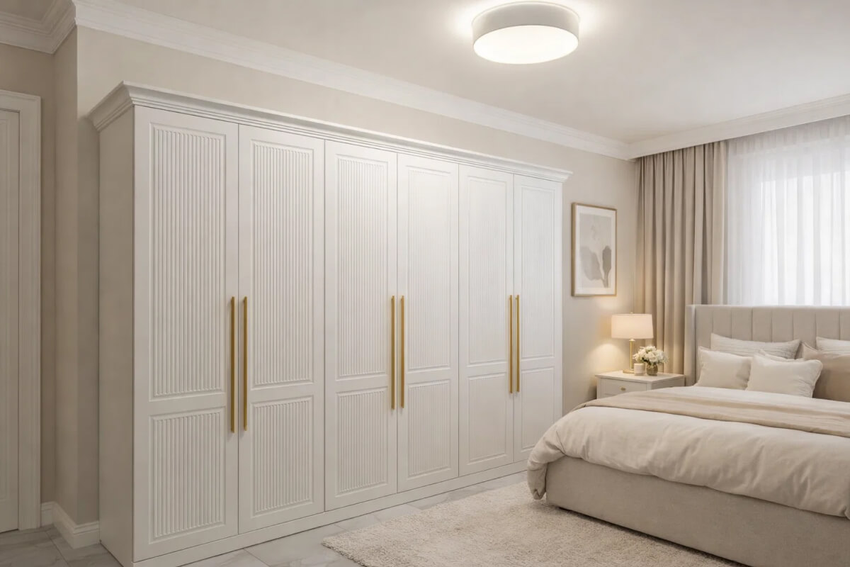 Элегантный 4-дверный шкаф с рельефными фасадами и вертикальными ручками в золотом оттенке. Модель сочетает строгий стиль и удобную организацию внутреннего пространства. Выполнен из высококачественной ЛДСП, доступен в белом, сером и бежевом цвете. Подходит для спальни, прихожей или гардеробной. Отличное решение для современных интерьеров.