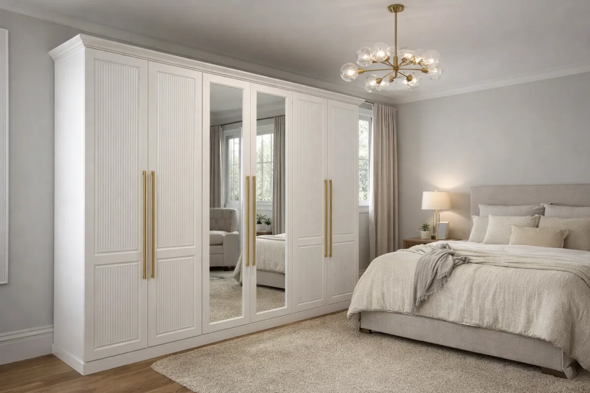 Шестидверный шкаф премиального стиля с зеркальными вставками и выразительной рельефной отделкой. Благодаря ширине 270 см и продуманной системе хранения, модель идеально подойдёт для просторной спальни. Изготавливается в классических цветах: белом, сером и бежевом. Гармоничное сочетание дизайна, вместительности и качества — оптимальный выбор для дома.