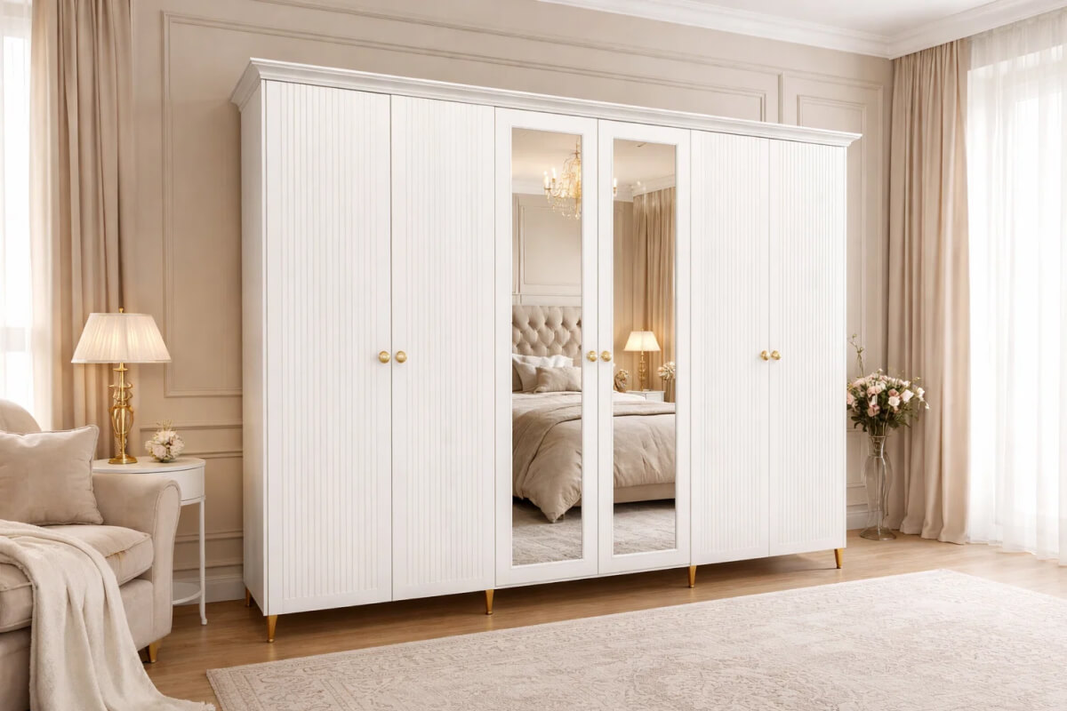 Элегантный 4-дверный шкаф с рельефными фасадами и вертикальными ручками в золотом оттенке. Модель сочетает строгий стиль и удобную организацию внутреннего пространства. Выполнен из высококачественной ЛДСП, доступен в белом, сером и бежевом цвете. Подходит для спальни, прихожей или гардеробной. Отличное решение для современных интерьеров.