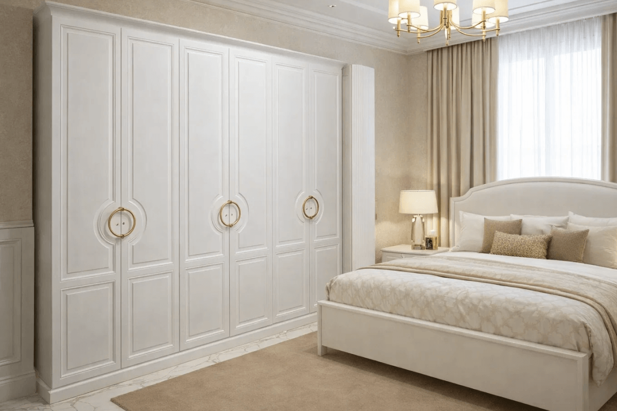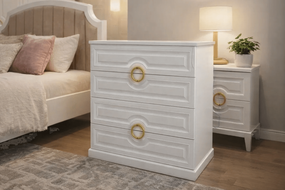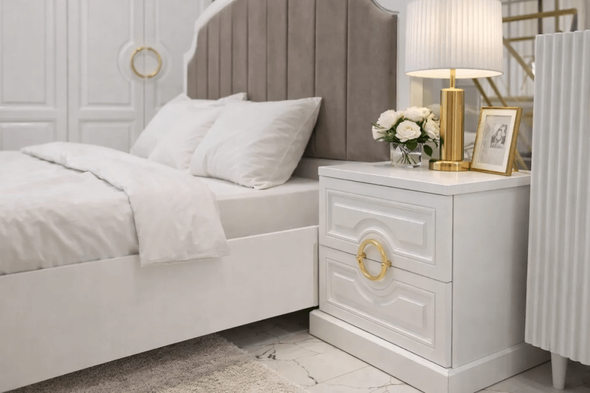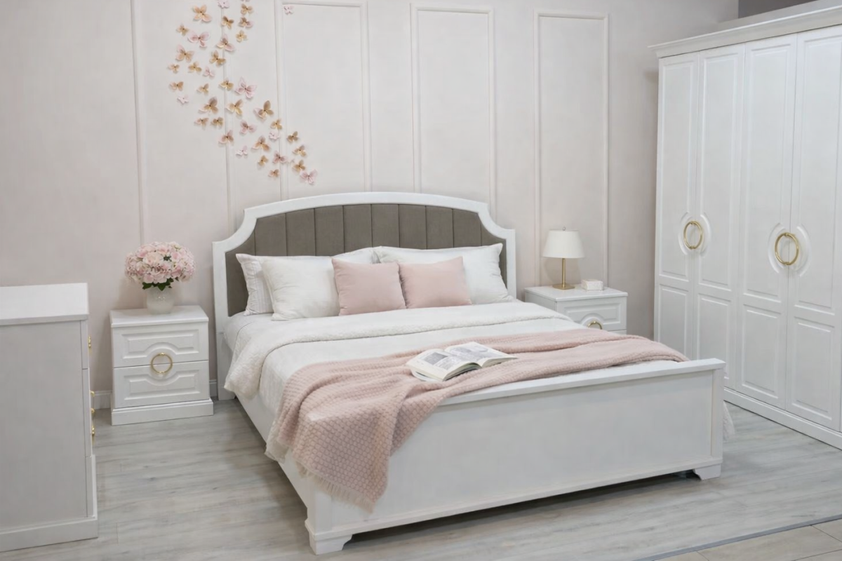 «Мая» — это спальня, в которой утро начинается с уюта. Элегантный белый цвет, изысканные золотистые акценты и мягкое изголовье превращают интерьер в оазис покоя и стиля.